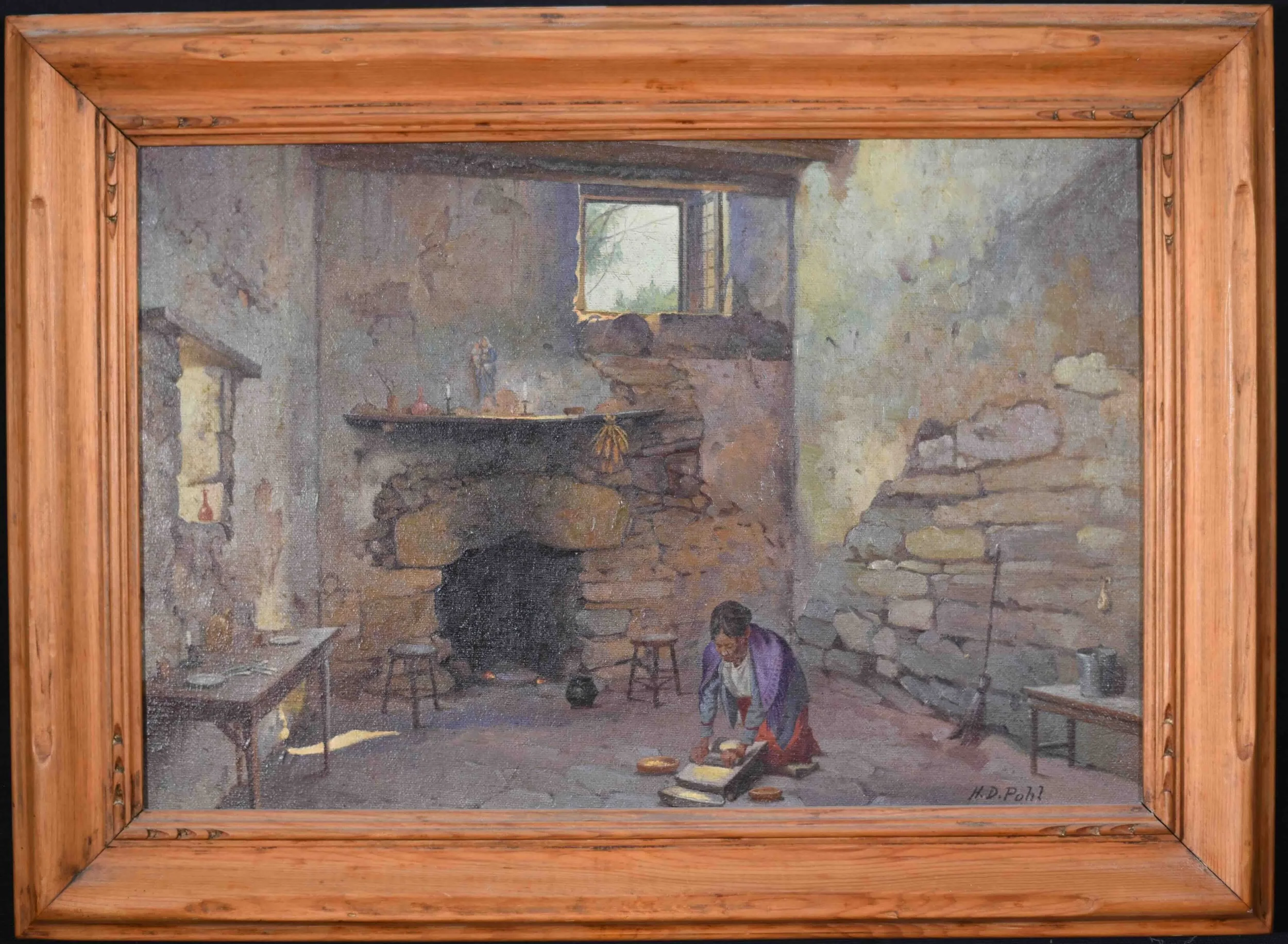 Painting of a person in a rustic stone room, kneeling by a cast-iron stove, surrounded by vintage furniture and an open window