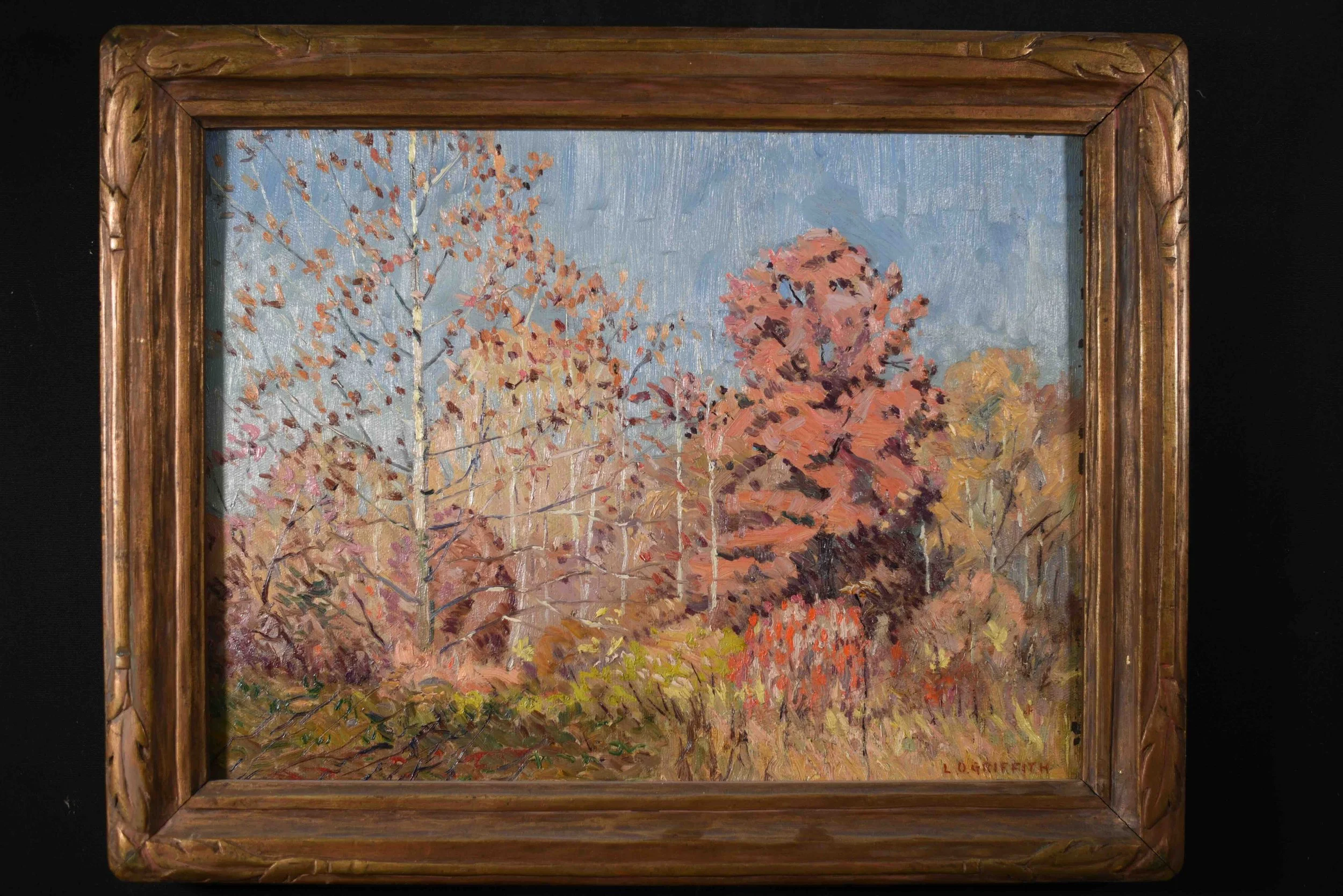 A landscape oil painting depicting trees with autumn foliage in a wooded area, framed in a carved wooden frame.