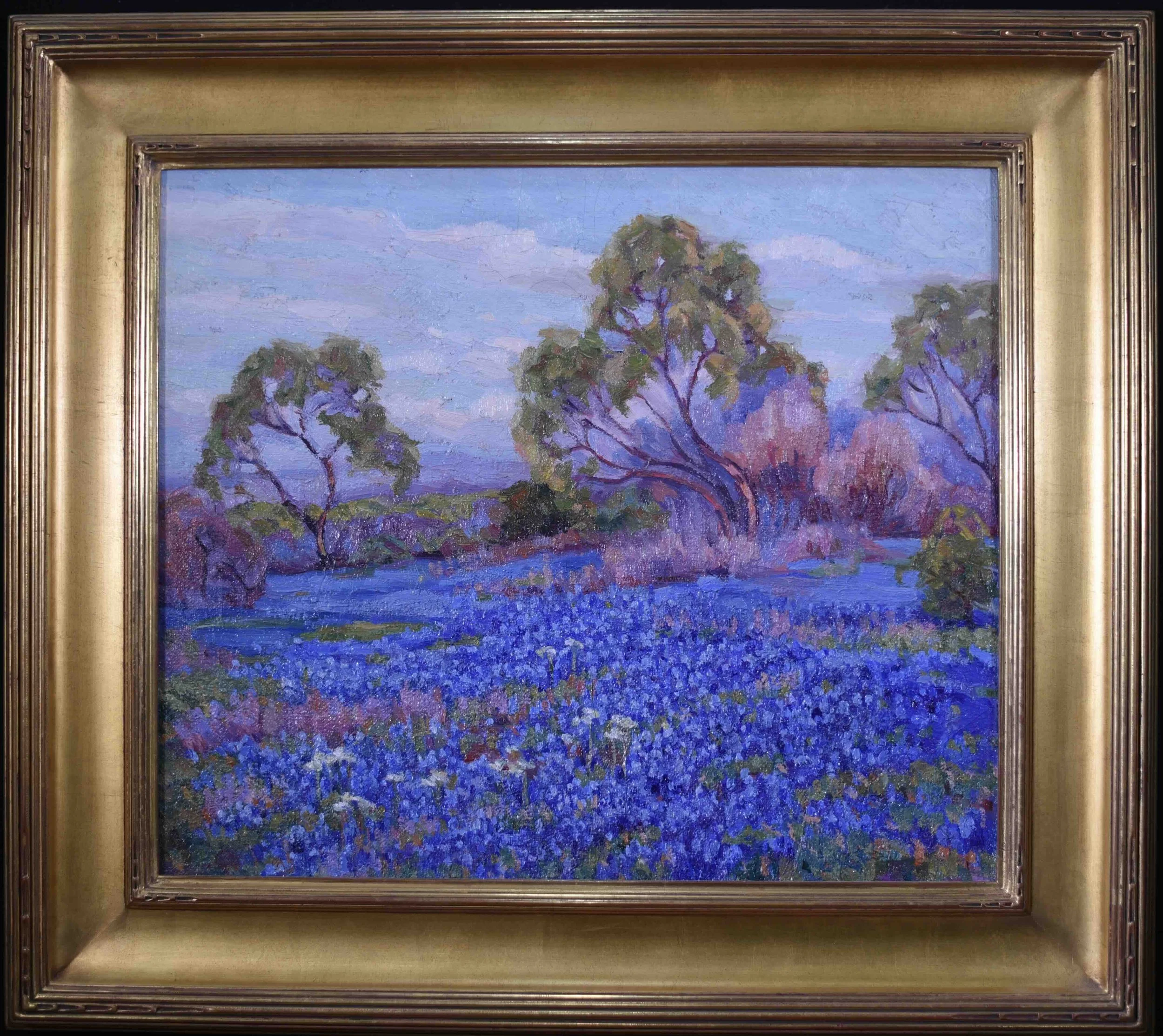 Painting of a landscape with purple flowers, green trees, and a cloudy sky, framed with a gold and wooden border.