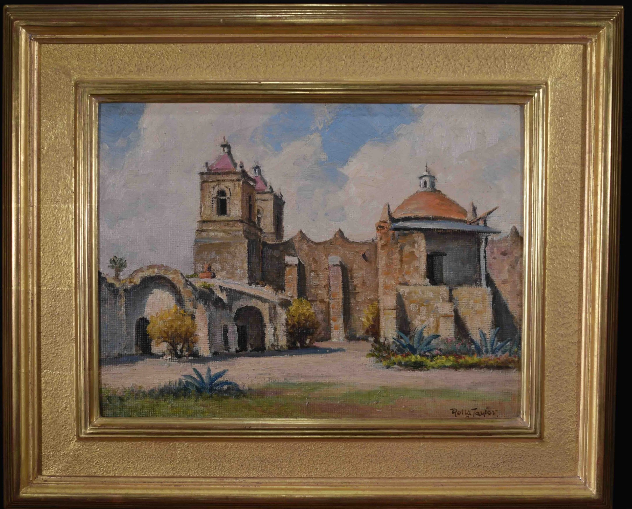Painting of a historical building with towers, archways, and a courtyard, signed by Rotta Taison.